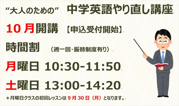 TOP 大人英会話 中学生英会話 子供英会話 月謝・費用 講師 アクセス About Us よくある質問 メールマガジン LINK集 お問い合わせ Blog